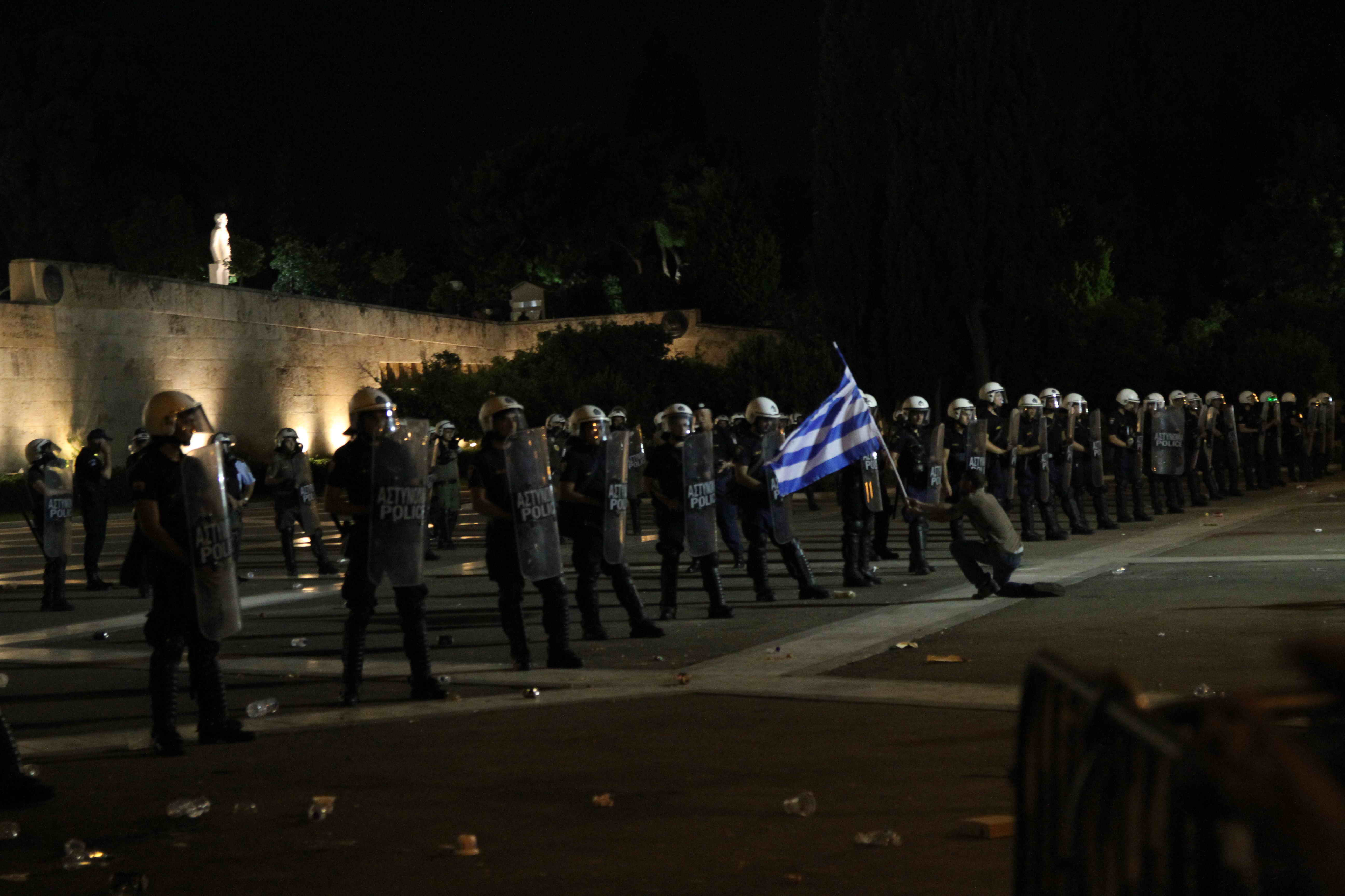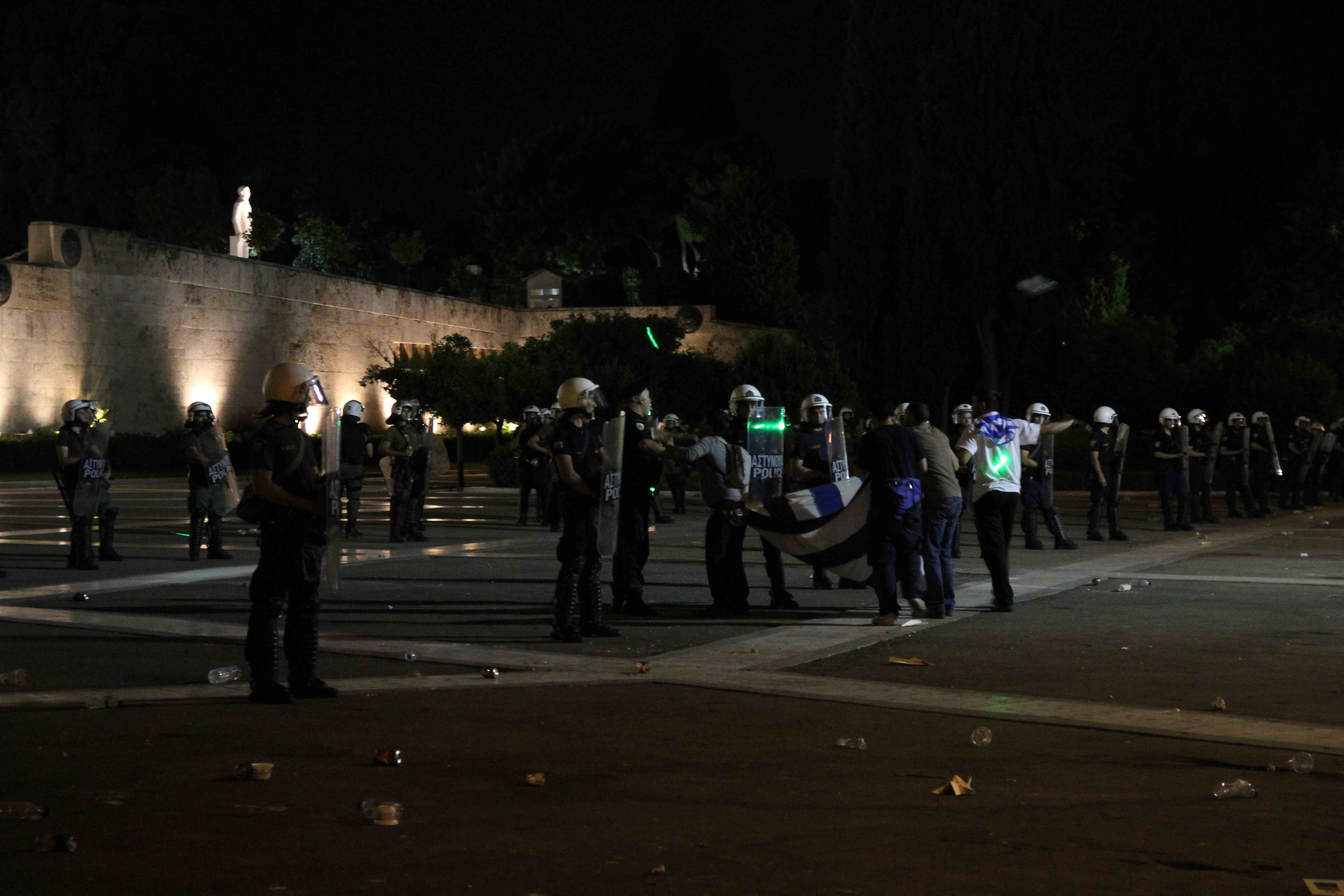 Ταυτόχρονα οι διαδηλωτές, με συνθήματα, αποδοκίμασαν τις αστυνομικές δυνάμεις για τη στάση που κράτησαν στη διάρκεια των συλλαλητηρίων της περασμένης εβδομάδας.