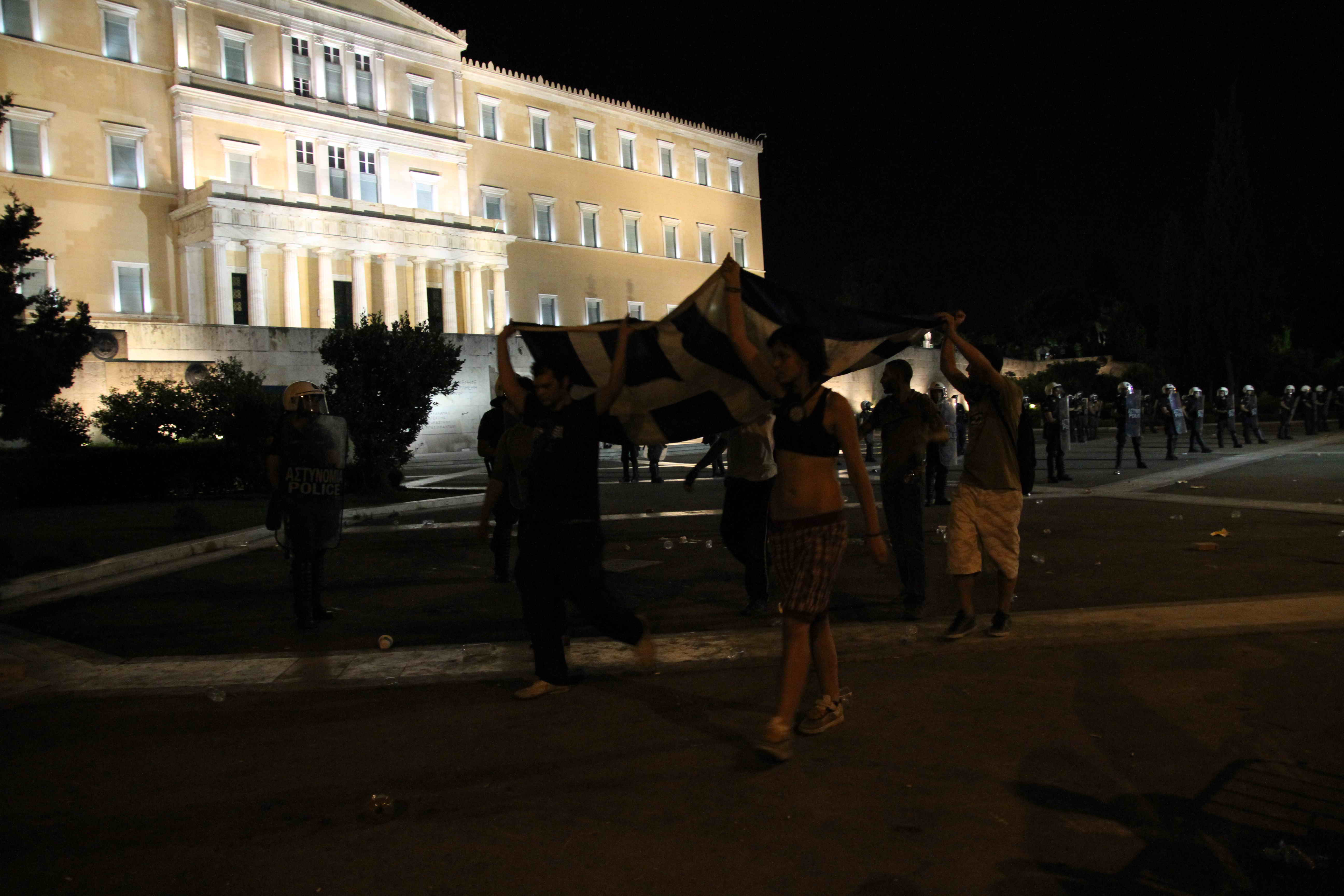 Για 40η συνεχόμενη μέρα και έκτη Κυριακή, διαδήλωσαν και σήμερα οι Αγανακτισμένοι στην πλατεία Συντάγματος, μπροστά από το κτίριο της Βουλής, εκφράζοντας την αντίθεσή τους στην εφαρμογή του Μνημονίου και ζητώντας την απόσυρση του Μεσοπρόθεσμου Προγράμματος και του Εφαρμοστικού νόμου.